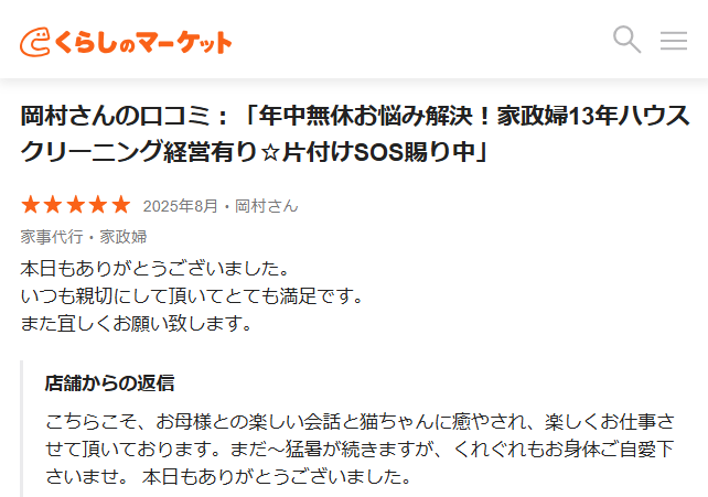 【心温まるお声】暮らしのマーケットで嬉しい口コミを頂きました!|熊本市で家事代行サービスや家政婦をお探しの方へ!リーズナブルな料金で充実のサポートを提供します。