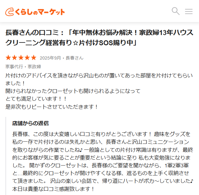 【心温まるお声】暮らしのマーケットで嬉しい口コミを頂きました!|熊本市で家事代行サービスや家政婦をお探しの方へ!リーズナブルな料金で充実のサポートを提供します。