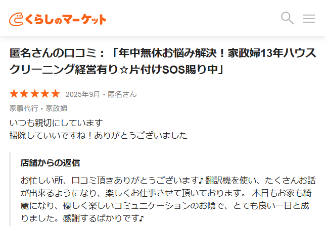 【心温まるお声】暮らしのマーケットで嬉しい口コミを頂きました!|熊本市で家事代行サービスや家政婦をお探しの方へ!リーズナブルな料金で充実のサポートを提供します。