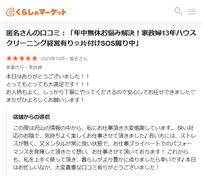 【心温まるお声】暮らしのマーケットで嬉しい口コミを頂きました!|熊本市で家事代行サービスや家政婦をお探しの方へ!リーズナブルな料金で充実のサポートを提供します。