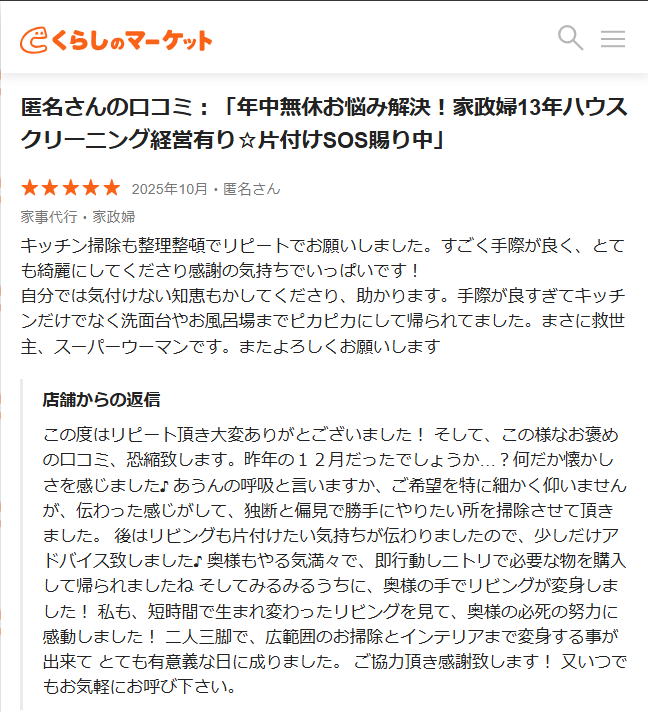 【心温まるお声】暮らしのマーケットで嬉しい口コミを頂きました!|熊本市で家事代行サービスや家政婦をお探しの方へ!リーズナブルな料金で充実のサポートを提供します。
