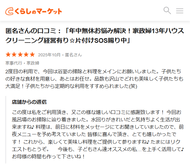 【心温まるお声】暮らしのマーケットで嬉しい口コミを頂きました!|熊本市で家事代行サービスや家政婦をお探しの方へ!リーズナブルな料金で充実のサポートを提供します。